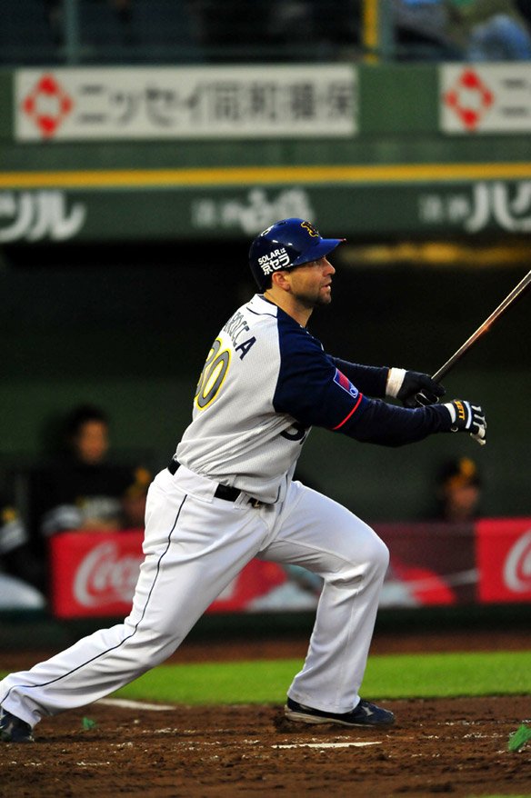 7番 長谷川 左翼二 アウトコースへの変化球を上手く流された3塁線への打球にラロッカが飛びついたが、打球はそのままレフト線へ抜ける2点タイムリー2ベース・・・ オ4-7ソ ![]() 4