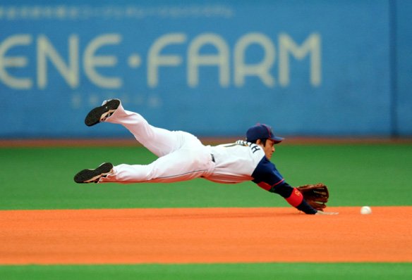 投手 長谷川 5番 高山 右安 外角高めへのストレートを右方向に打ち返された痛烈なライナー性の打球を赤田が後退してワンバウンドで捕球 |