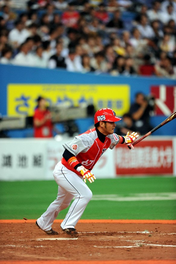 5番 多村 左中二 初球の外角への変化球を上手くバットに乗せて左中間へ運ばれ、打球はワンバウンドでフェンスに到達 |