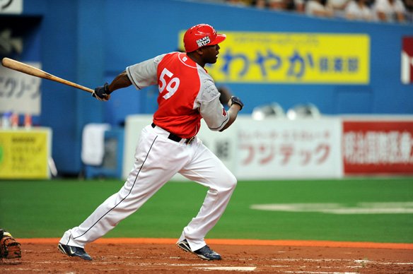 8番 長谷川 一ゴ 122km/hの変化球を引っ張らせたゴロはファーストの正面に転がり、カブレラが捌いてそのまま1塁ベースを踏んだ! |