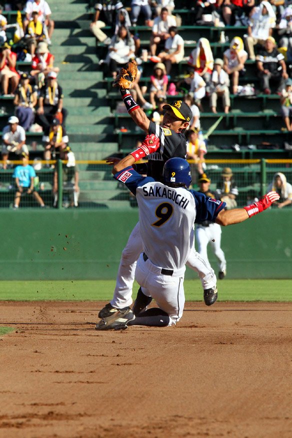 田口の打席で1塁ランナーの坂口がスタート! キャッチャーは2塁へ送球するもボールは高く、余裕のセーフ!盗塁成功!! |