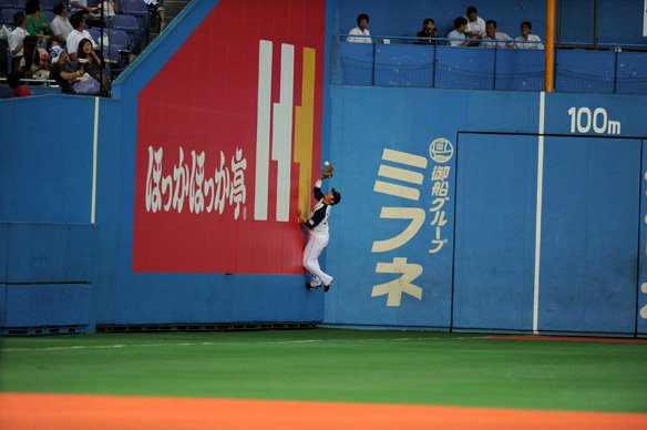 投手 金子 1番 西岡 左邪飛 高めのストレートを流された当たりがレフト線のファウルゾーンへ切れていったが、T-岡田がこの打球を追い、フェンスを蹴って登るようにして見事にジャンピングキャッチ! ナイスプレーT-岡田!! |
