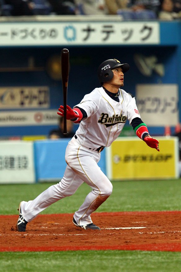 投手 ファルケンボーグ 4番 T-岡田 左中二 外角高めへのストレートを逆らわずに打ち返した打球が左中間方向に飛び、センターの頭上を越えてフェンスまで到達! 打ったT-岡田は余裕で2塁へ!! |