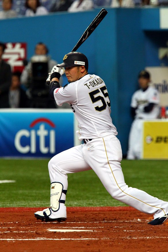 6番 李スンヨプ 右中二 真ん中低めへの変化球を振り抜いたライナー性の打球はグングン伸びてフェンス最上部に直撃! 1塁ランナーのT-岡田は3塁、打った李スンヨプは悠々2塁へ!! |