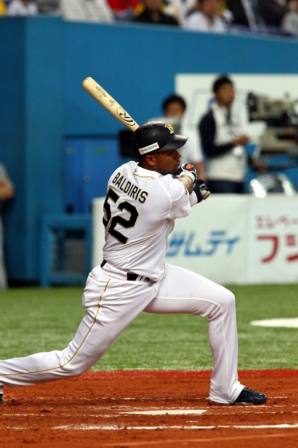 投手 岩田稔 7番 バルディリス 遊ゴ 低めへの変化球を叩いたゴロをショートがファンブルした後、1塁へ送球。バルディリスは1塁ヘッドスライディングも間に合わず。 |