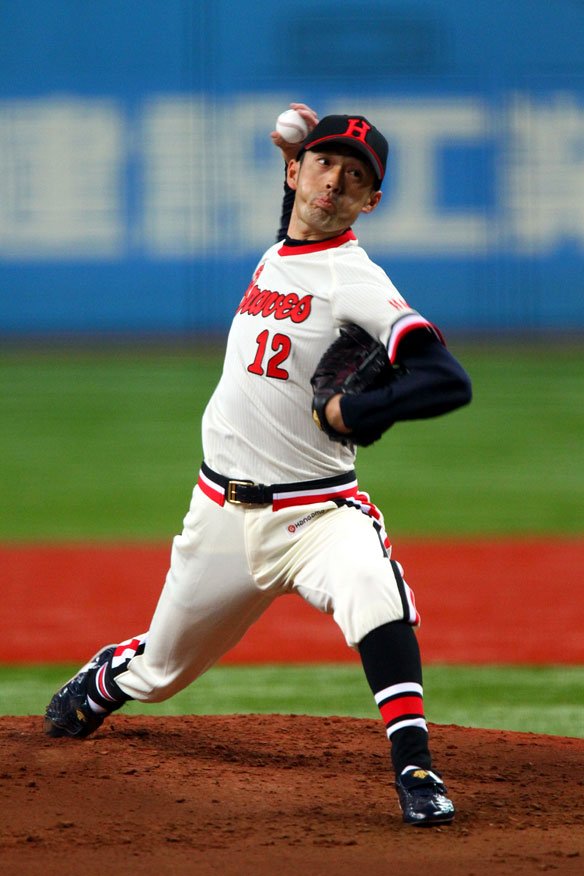 投手 木佐貫 4番 トレーシー 二ゴ 真ん中低めの142km/hのストレートを引っ張られるも、打球は梶本勇の正面に転がり、軽快な動きで捌いた! |