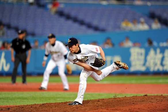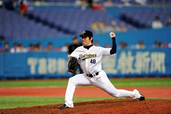 投手 平野佳 9番 藤田 三ゴ 外角高めへのストレートを叩かれたゴロを、山崎浩が上手く捕球し、1塁へランニングスロー! |