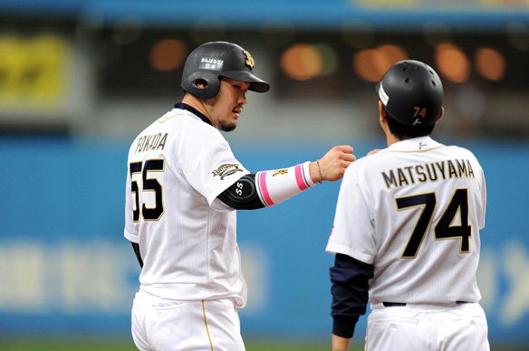 4番 T-岡田 左安 外角へ逃げていく変化球に泳がされるも、チョコンと当てた打球がショートの後方に落ちた!! 2塁ランナーの田口が還って勝ち越し!!! オ3-2横 ![]() 3