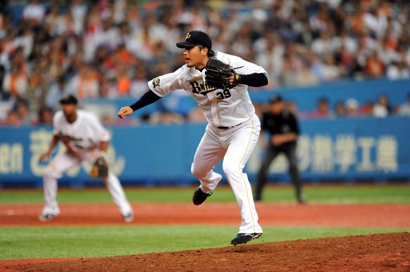 1番 亀井 左飛 初球の外角高めの小さく落ちる変化球でタイミングを完全に外した。力の無いフライに余裕を持ってT-岡田が落下点に入った。 |