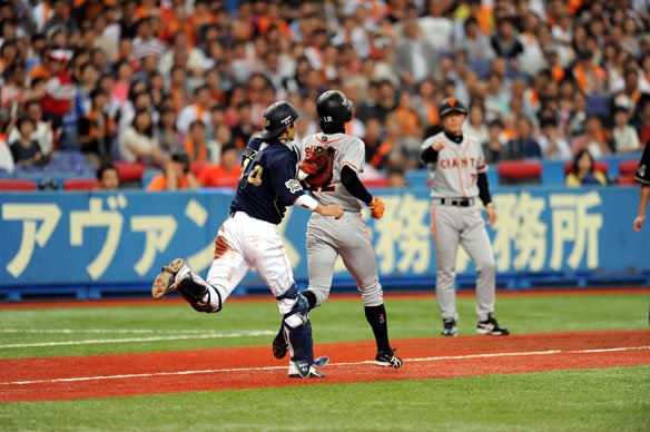 6番 長野 中安 高めの直球を弾き返された打球は岸田の足元を抜けて、センター前にゴロで転がっていった。2塁ランナーが生還。 オ3-2巨 ![]() 3