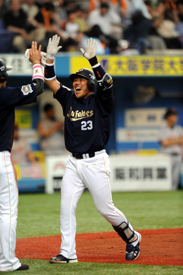 5番 北川 左本 高めの直球を振り抜き、がつ~~んという快音を残した打球はグングン伸びて左翼席に突き刺さった! 今シーズン第1号は、勝ち越しの2ランホ~ムラン!! オ3-1巨 ![]() 3