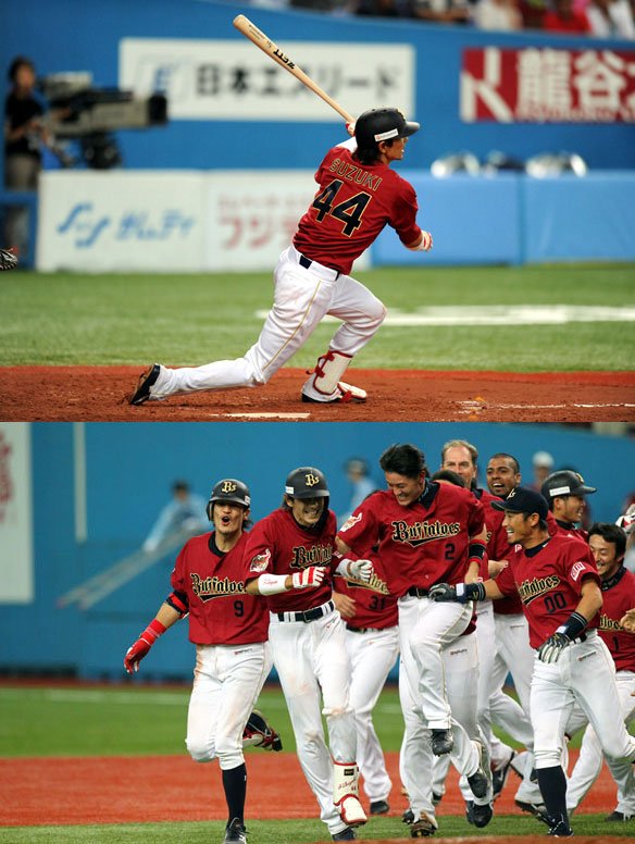 サヨナラ打を放つ鈴木選手と、歓喜のナイン