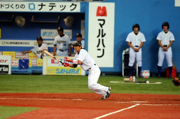 3番 後藤 左翼二 初球の外角へのストレートを逆らわずに打ち返したライナー性の打球が前進するレフトの前にワンバウンド! さらにレフトが打球の処理を誤ってボールを後逸し、この間に一気に1塁から大引が還って勝ち越し!!! 打った後藤も悠々2塁へ進んだ!!!記録はツーベース。 オ3-2日 ![]() 3