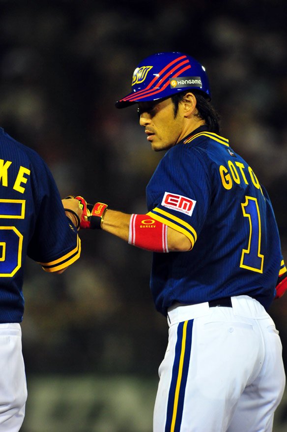 7番 秋山 一ゴ 外角への変化球を引っ掛けさせたボテボテのゴロを李スンヨプが捌く間に、1,2塁ランナーはそれぞれ2,3塁へ進塁。 |