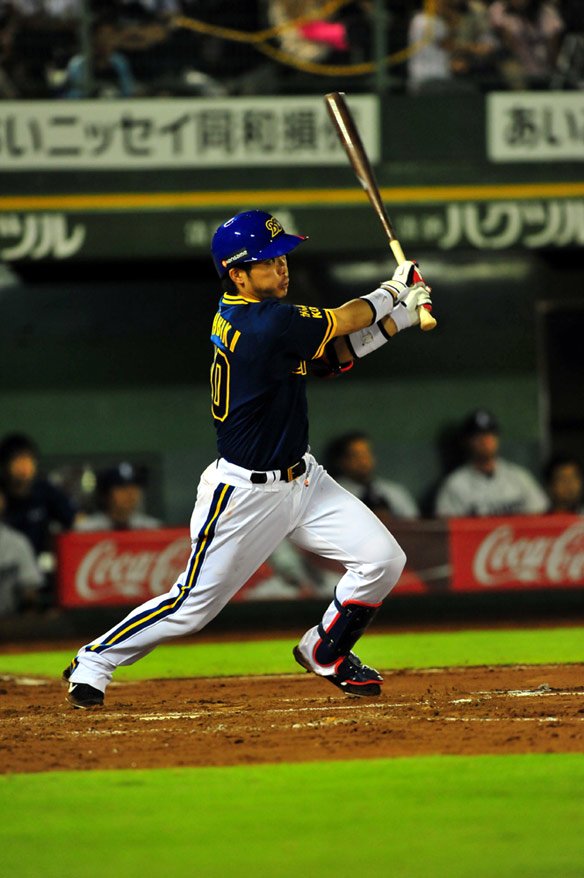 1番 坂口 右翼二 フルカウントから内角への変化球に上手く合わせて引っ張り、打球はライト線を抜けていった! 打球はフェンスまで到達し、1塁から由田が一気に生還!!!打った坂口もライトがクッションボールの処理にもたつく間に3塁まで進んだ! 記録はツーベースとライトの失策!! オ2-4西 ![]() 2