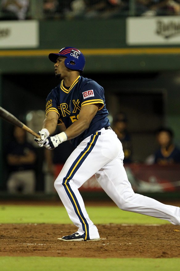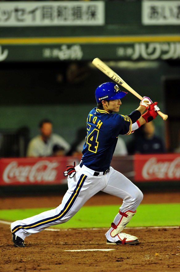5番 バルディリス 左安 アウトコースやや高めの124km/hの変化球を振り抜き、鋭い打球が三遊間をあっという間に破った! |