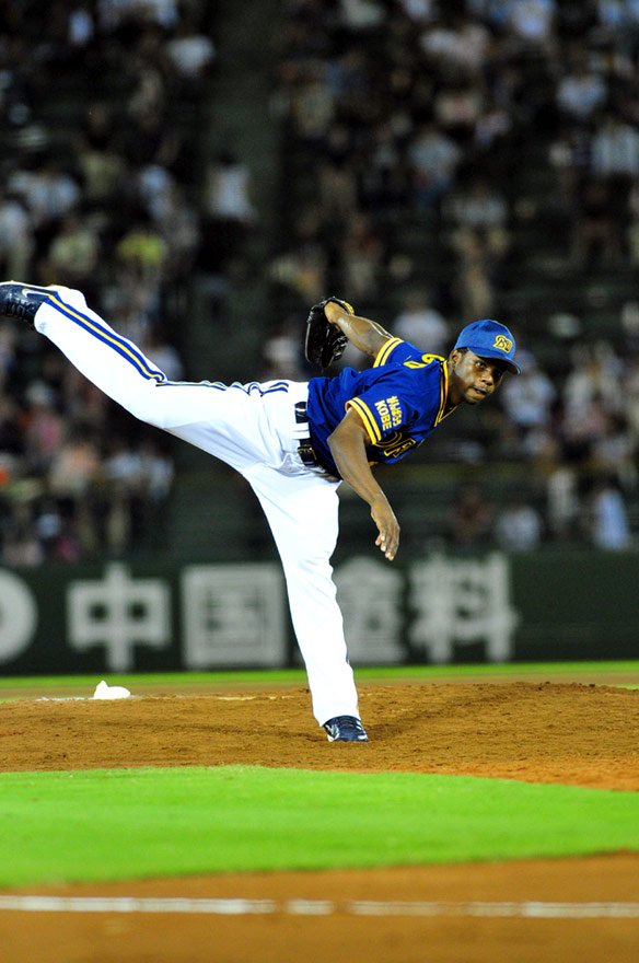 投手 岡本篤 5番 バルディリス 空三振 外角低めにワンバウンドした130m/hの変化球を振ってしまった・・・ |