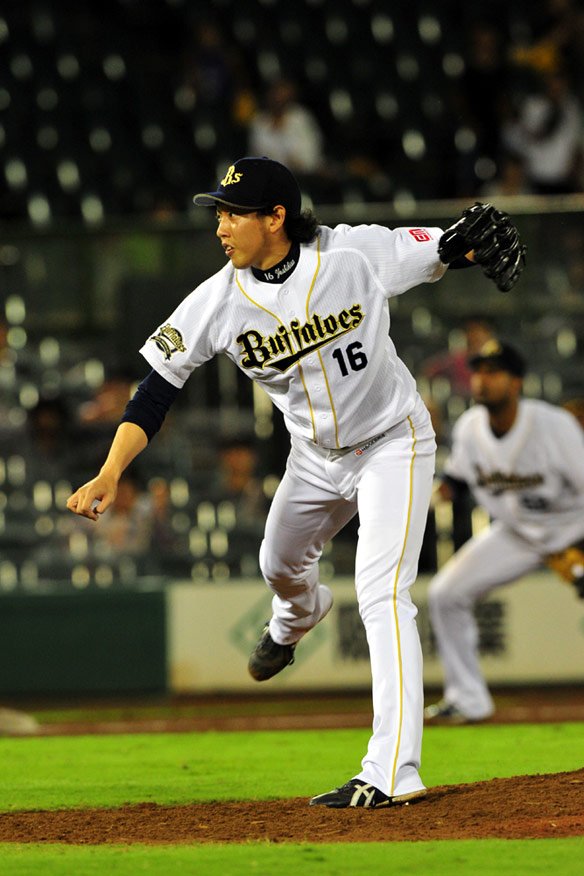 投手 金子 6番 ガルシア 中安 内角高めを突いた変化球で詰まらせるも、高く上がった打球が前進するT-岡田と坂口の前にポトリと落ちた。 |