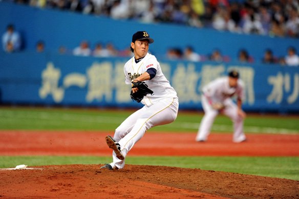 投手 金子 1番 川崎 一ゴ 外角への抜いた変化球を引っ掛けさせたゴロをT-岡田が正面で掴み、1塁ベースカバーに入った金子千尋へトス! |