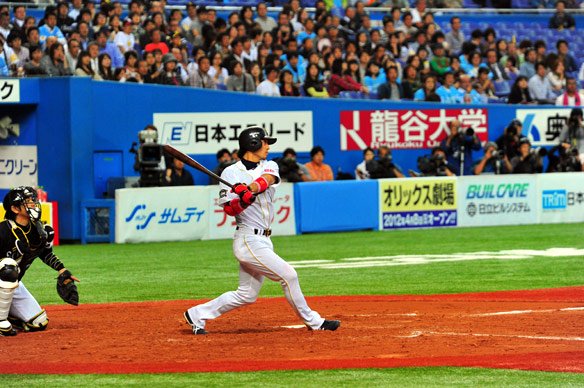 投手 平野佳 5番 多村 二ゴ 初球の外角低めへの変化球をおっつけられるも、一二塁間への当たりを後藤が正面に入って捕球し1塁へ! |