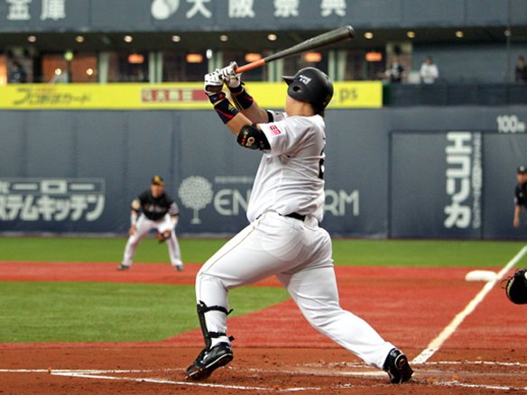投手 金無英 6番 T-岡田 中安 0-2から外角のフォークボールにうまくバットを合わせ、打球はライナーとなりジャンプしたセカンドの頭上を越えてセンター前へ! |