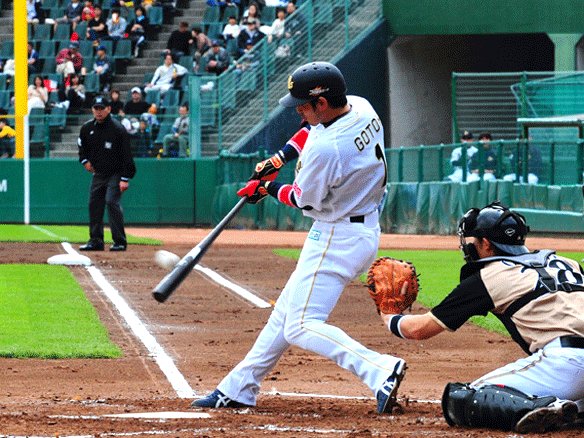 3番 後藤 左安 0-1から真ん中低めのシュートをすくい上げ、打球は詰まりながらもレフトの前で弾んだ! 後藤はこれで6試合連続ヒット! |
