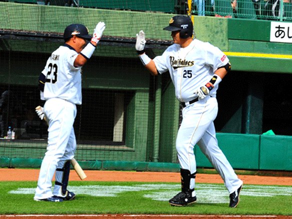 4番 李大浩 左本 フルカウントから真ん中のスライダーを鋭く振り抜き、打球は打った瞬間にそれと分かる当たりとなってレフトスタンド中段に飛び込んだ! 李大浩の来日初本塁打となる1号ソロで1対4! ついに李大浩に待望の一発が飛び出した! ![]() 1