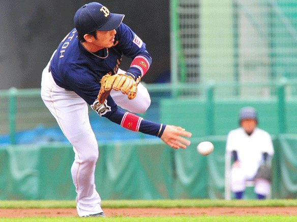 5番 稲葉 一ゴ 1-0からの外角低めのフォークを引っ掛けさせると、ボテボテの打球をファーストが正面で落ち着いてさばいた。 |