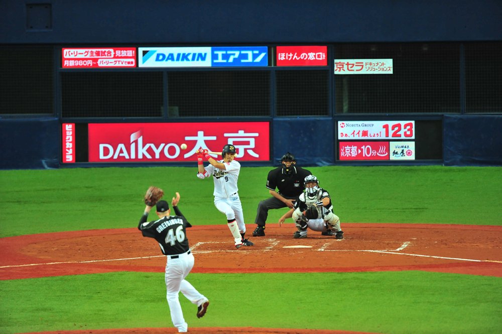 | 1アウト | 投手 グライシンガー 3番 後藤 捕邪飛 初球、高めのカットボールを打つも、打球は高々とファウルゾーンに上がり、キャッチャーが捕球した。 |