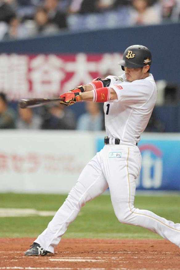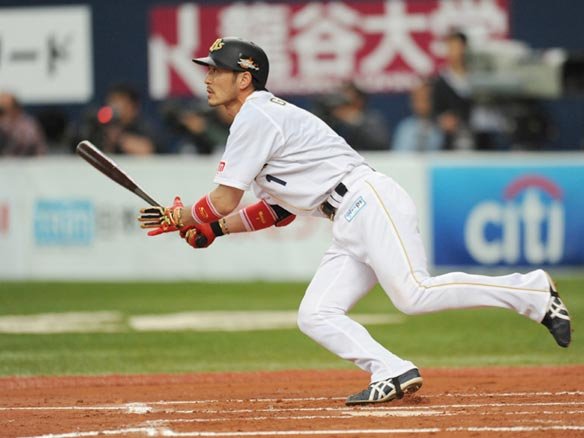 1番 聖澤 左安 初球、外角のスライダーをうまく捉えられ、打球はレフトの前で弾んだ。 |