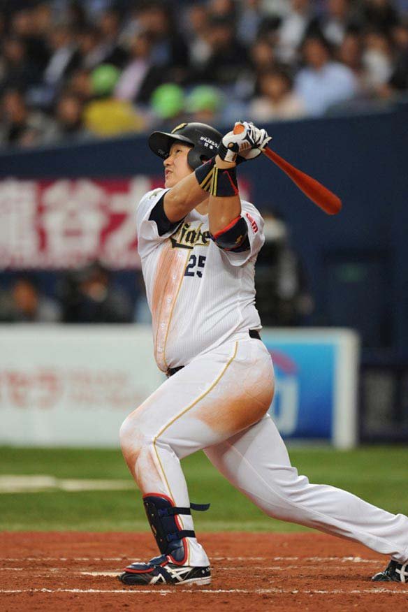 投手 戸村 4番 李大浩 中安 0-2からやや真ん中に入ってきたスライダーをコンパクトに振り抜き、打球は二遊間を抜けた! |