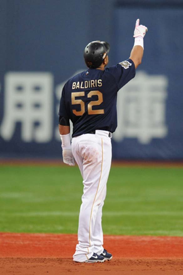 二塁打を放ち、ポーズを決めるバルディリス選手