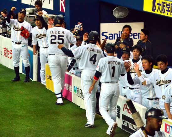 チームメイトに迎えられる李大浩選手・スケールズ選手・後藤選手