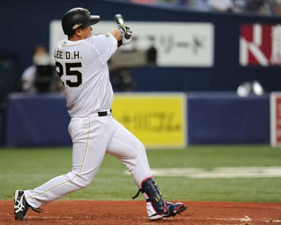 4番 李大浩 左安 1-2から真ん中高めに浮いたストレートをコンパクトに振り抜くと、弾んだ打球は三遊間へ飛びついたサードのグラブの脇を抜けていった! |