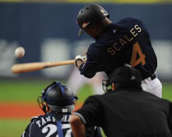 1番 スケールズ 三邪飛 初球、内角のボールに詰まらされた打球はファウルゾーンにフラフラと上がり、最後はサードに余裕を持ってキャッチされた。 |