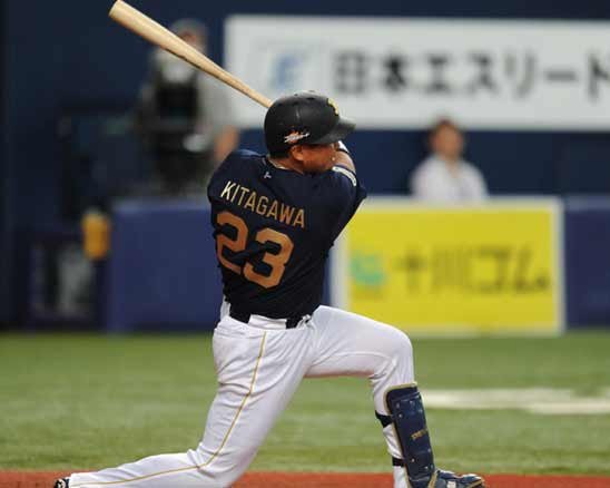 5番 北川 左中二 1-2から真ん中に入ってきたスライダーを打ち返した打球は左中間を真っ二つに破っていった! 打った北川は余裕を持って2塁に到達! |