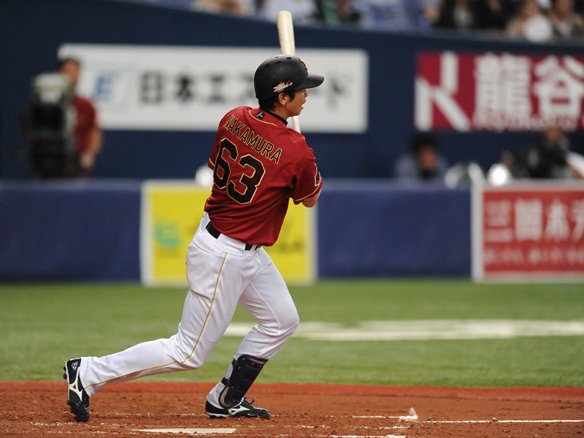 4番 サブロー 中安 2-1から外角のストレートをはじき返された打球にピッチャーがグラブを出すもわずかに及ばず、センター前へと転がっていった。 |