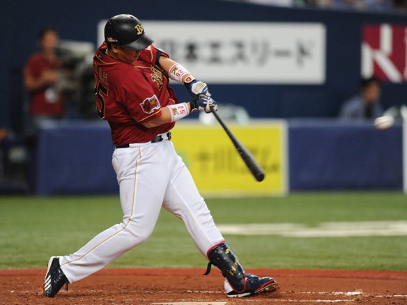 4番 李大浩 右中二 2-2から真ん中に入ったストレートをおっつけた打球は右中間の真ん中を抜けていった。ライトが打球に追いつく間にバッターランナーは悠々2塁へ到達。 |