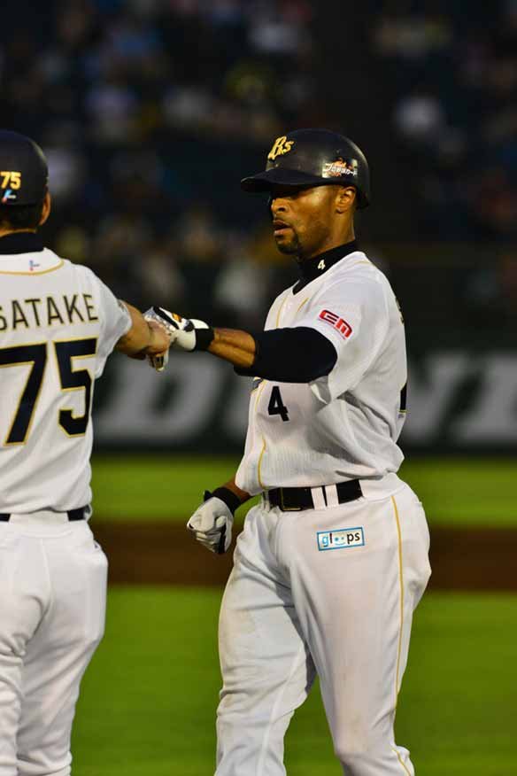 4番 李大浩 中飛 初球、低めのストレートをはじき返した打球は、フェンス手前でセンターに捕球された。センターからの返球が緩慢だったのをみた1塁ランナー・バルディリスがスタートを切り勢いよく滑り込んで2塁へ進塁! 相手の隙を見逃さない好走塁!  |