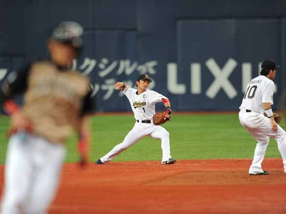 3番 糸井 遊ゴ 3-1からストレートを打たれた打球は高いバウンドのゴロでセンター前に抜けそうになるが、2塁ベース後方に回り込んだショート・大引が追い付き華麗にさばいた! |