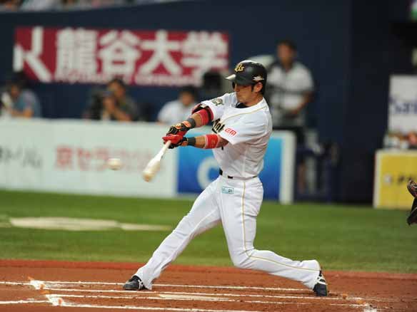 3番 糸井 三ゴ 1-1から外角のスライダーにタイミングをあわせて流し打たれた打球はサード正面の強いゴロに。一度こぼしてしまったが、落ち着いて1塁に送った。 |
