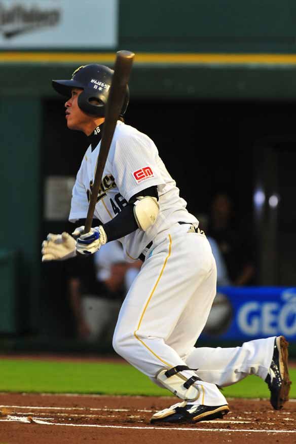 5番 T-岡田 左安 0-2から高めに浮いたストレートに軽いスイングで合わせ、低いライナーがサードの差し出したグラブの先を越え、レフト前へ! 技ありの一打でT-岡田は9試合連続ヒットとなった! |