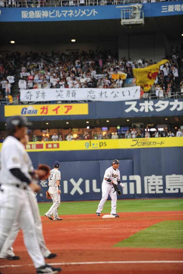 4番 李大浩 空三振 フルカウントから高めのストレートにバットが回ってしまった。しかしスタートを切っていた1塁ランナー・T-岡田は、キャッチャーからの送球が逸れ、盗塁成功! |