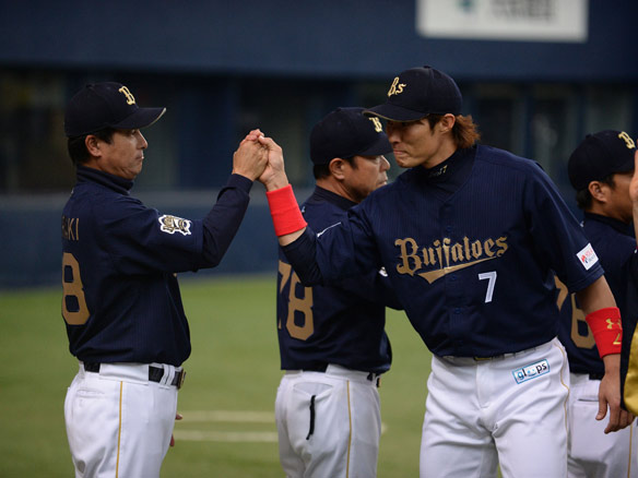 勝利のハイタッチをかわす森脇監督と糸井選手