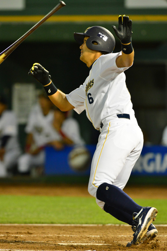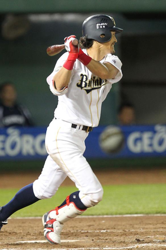 4番 李大浩 左翼安 レフトへのヒットを放つ 1塁 |