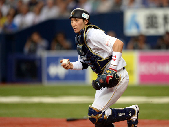 狭殺プレーでランナーを刺す伊藤選手