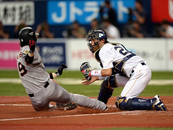 1塁走者亀井は3塁ベースをけってホームに向かうもアウト! オ0-2巨 2アウト2塁 |