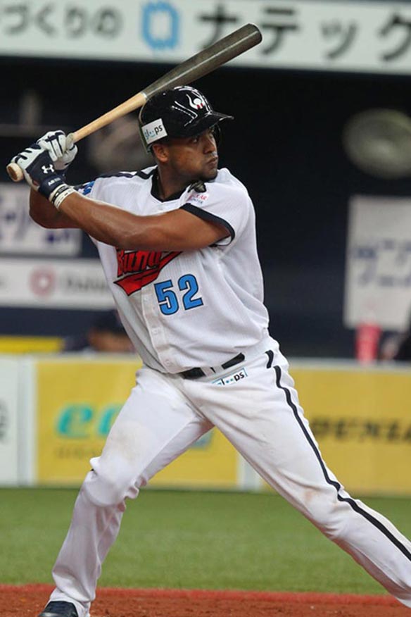 投手 金子千尋 4番 バレンティン 左安 カウント3-0からレフトへのヒットを放つ 1塁 |