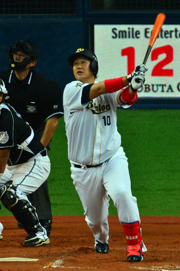 勝ち越しアーチをライトスタンドに運ぶ李大浩選手