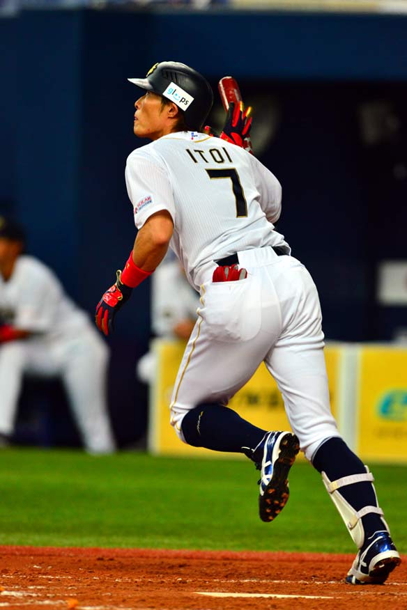 3番 糸井 四球 一度もバットを振ることなくフォアボールを選ぶ 1塁 |